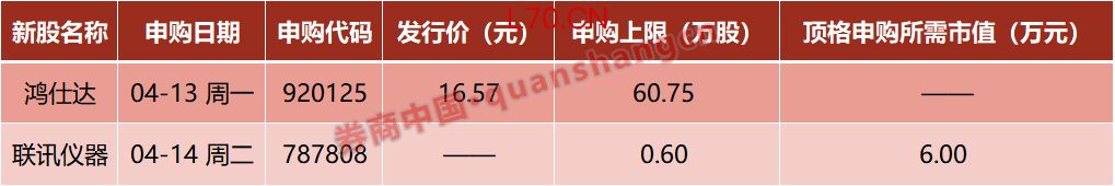 本周(4月13日—4月17日)有2只新股发行,周一:鸿仕达 ;周二:联讯仪器。