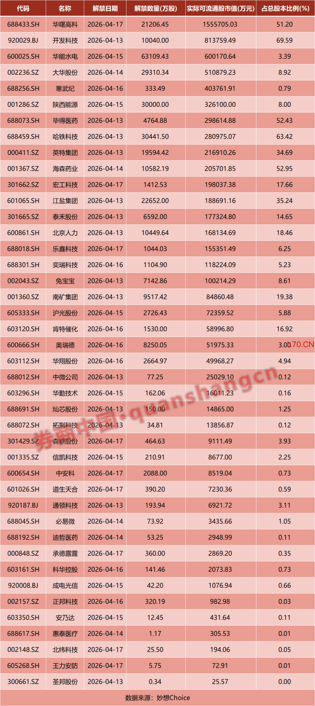 从解禁市值来看,居前三位的是:华曙高科(155.57亿元)、开发科技(81.38亿元)、华能水电(600025)(60.02亿元)。