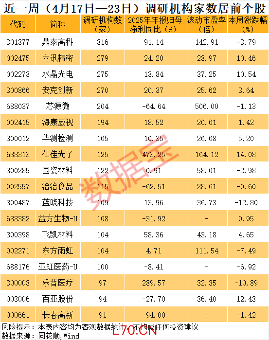 近一周机构调研个股有350多只,鼎泰高科调研机构数最多。