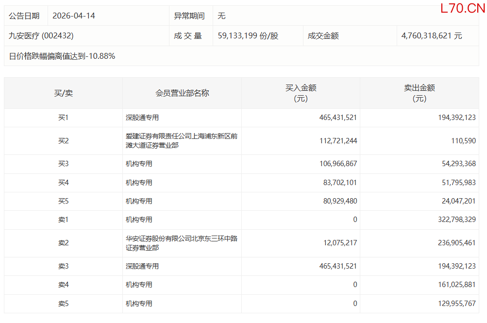 九安医疗今日跌9.46%,有3家机构专用席位净卖出6.14亿元九安医疗今日跌9.46%,有3家机构专用席位净卖出6.14亿元