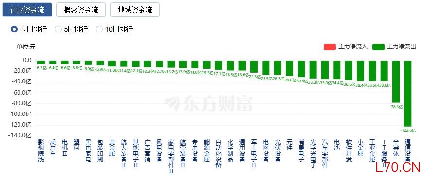 净流出方面,通信设备、半导体、IT服务等净流出排名靠前,其中通信设备净流出122.60亿元。