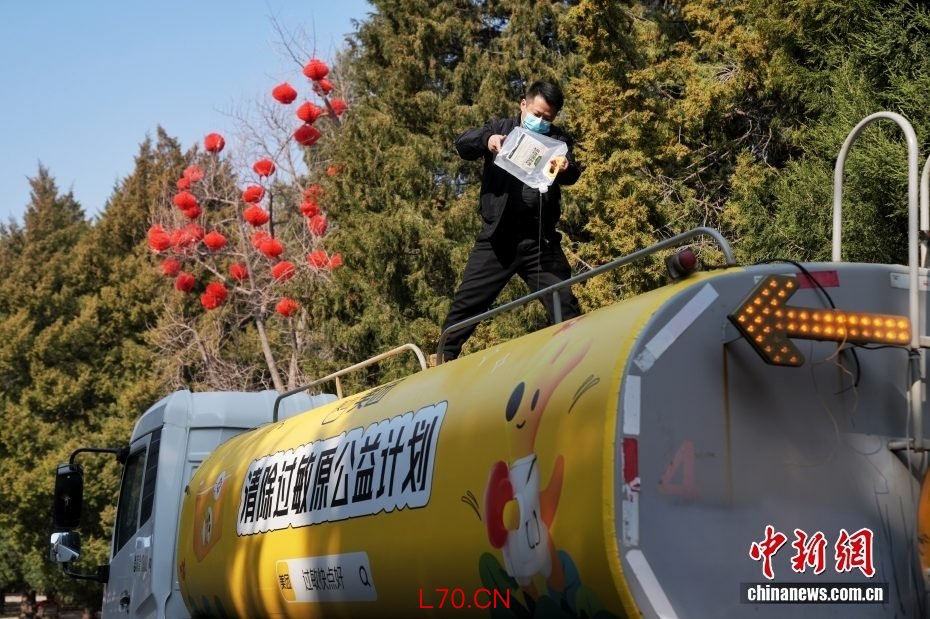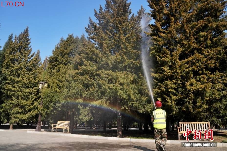 3月15日,工作人员在北京地坛公园向柏树喷洒花粉固定剂。
