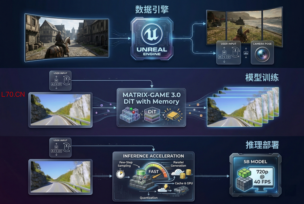 首先,昆仑万维正式发布Matrix-Game 3.0模型:物理仿真驱动下的实时交互式世界模型创新实践。从 2.0到3.0模型,我们完成了一次关键跃迁:从“可运行的交互Demo”,走向“具备稳定性与工业级性能的世界模型系统”。