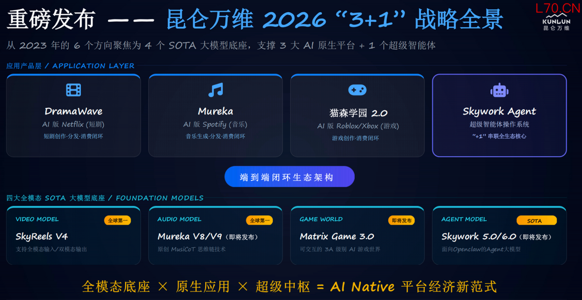 周亚辉正式发布昆仑万维2026年的AGI战略升级为“3+1”生态架构——以4个SOTA大模型为底座,支撑3大AI原生平台+1个超级智能体。