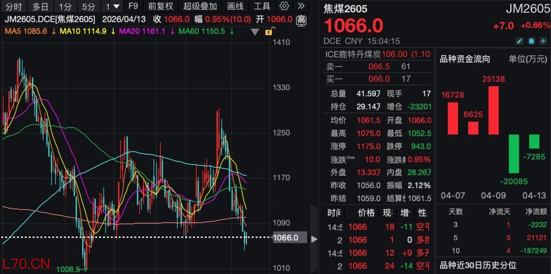 上游焦煤价格同步走出了弱势行情。4月13日,焦煤主力合约2605最低下探至1052.5元/吨,较3月下旬逼近1300元/吨的价格高点回落近20%。