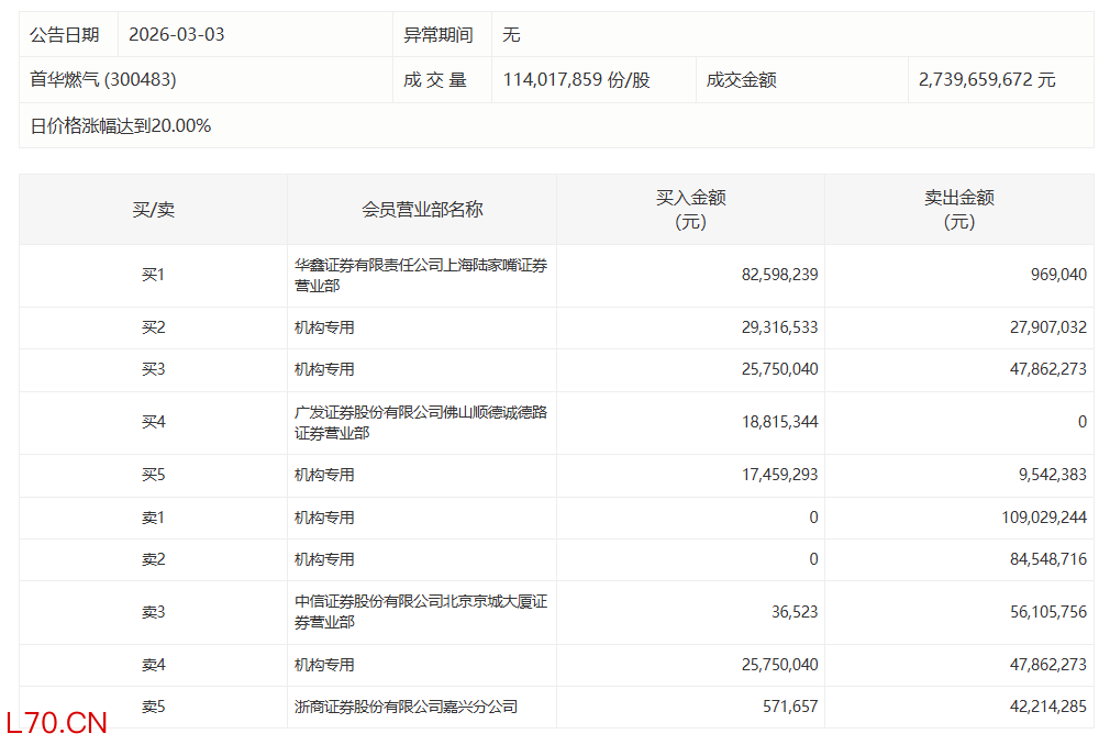 首华燃气今日20%涨停,有3家机构专用席位净卖出2.16亿元首华燃气今日20%涨停,有3家机构专用席位净卖出2.16亿元