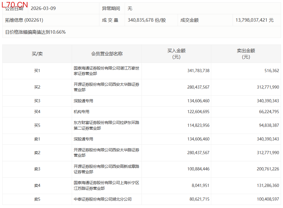 拓维信息今日涨停,国泰海通湛江万豪世家证券营业部净买入3.41亿元拓维信息今日涨停,国泰海通湛江万豪世家证券营业部净买入3.41亿元
